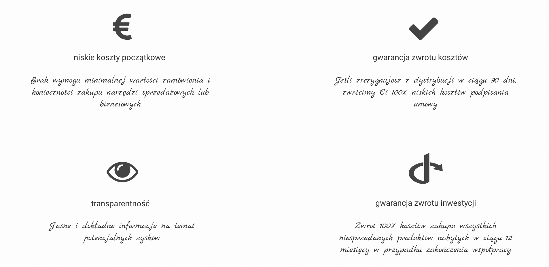 - umowa dystrybucyjna (oprócz prawa do handlu, otrzymujesz wysokie benefity sprzedażowe (do 50% upustu) oraz pakiety szkoleń mających na celu wspieranie klientów)