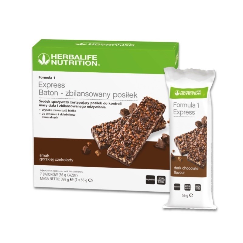 Osiągaj swoje cele, gdziekolwiek jesteś, mając pod ręką batony Formuła 1 Express. Odpowiednie dla wegetarian i idealne dla osób na diecie o ograniczonej wartości energetycznej, które chcą zastąpić posiłek poręcznym, słodkim batonem zawierającym tylko 209 kcal.